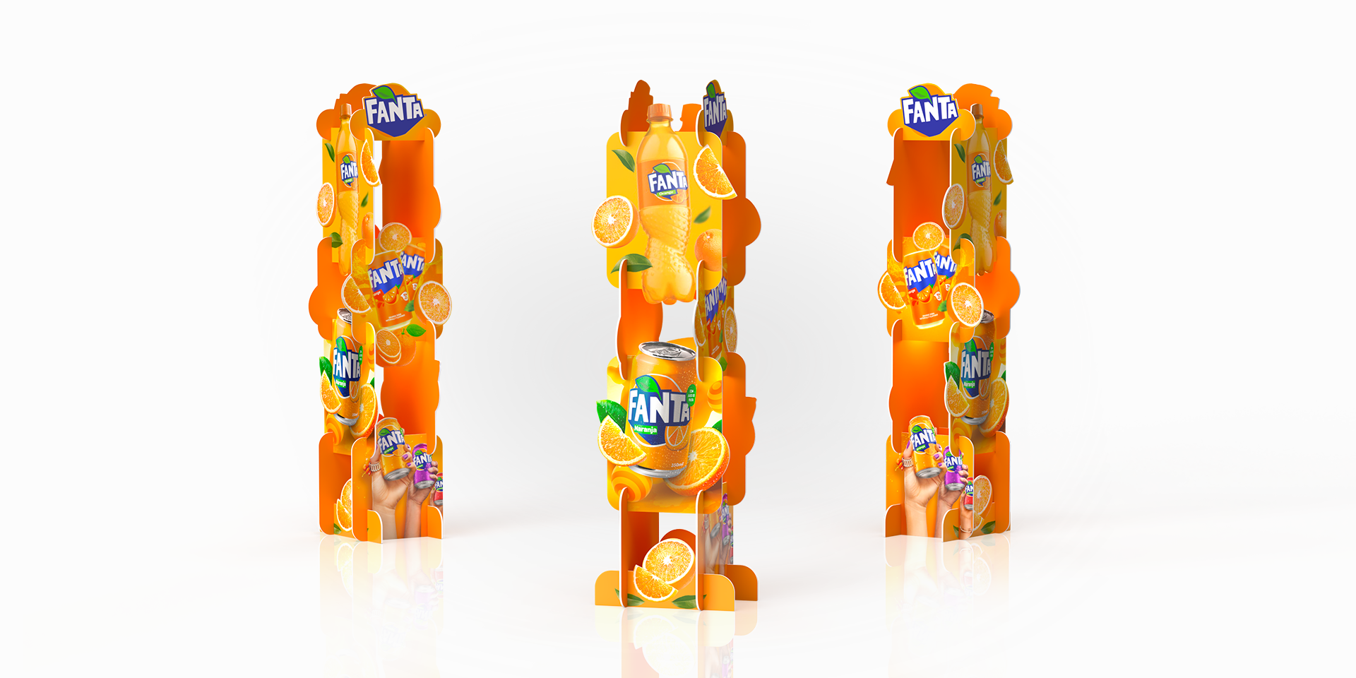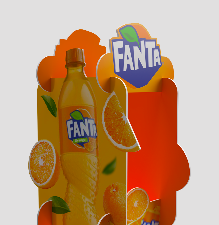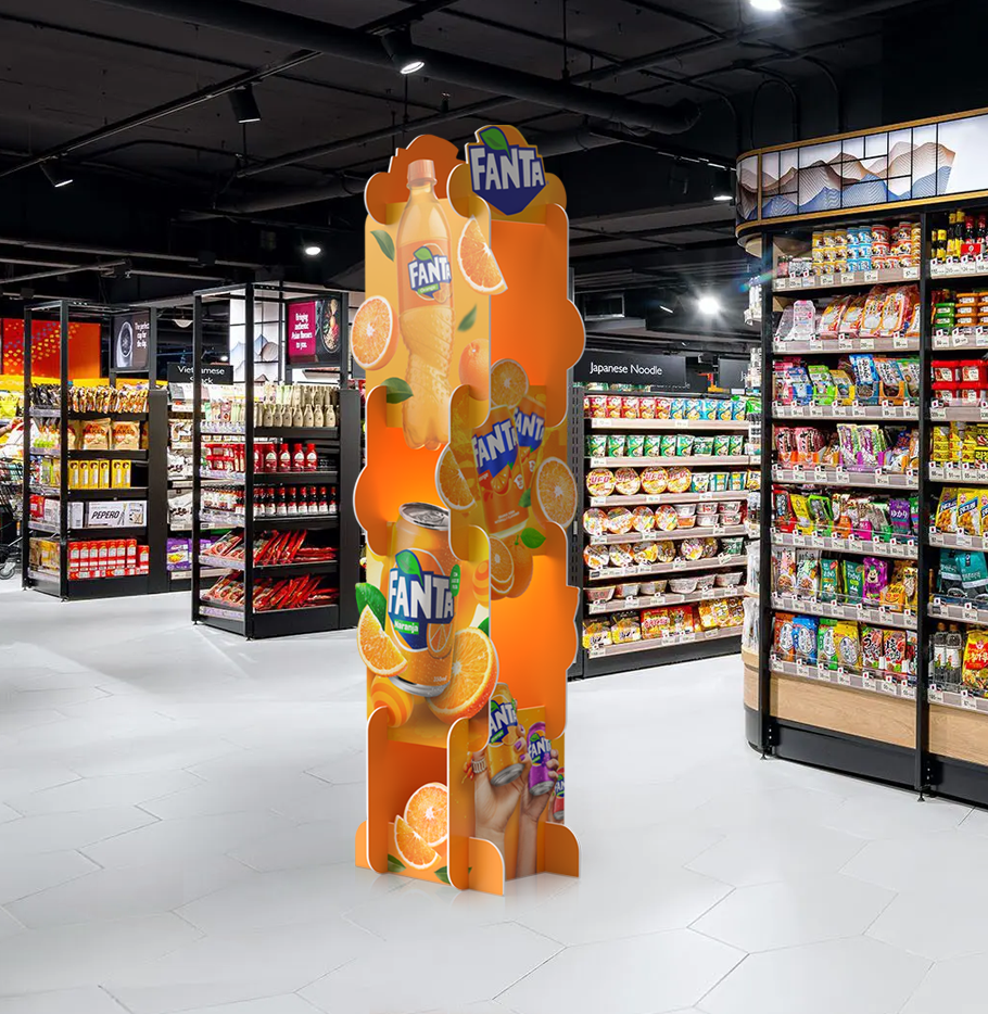 В оформлении для Fanta колонна MR.PILAR превращается в яркий FMCG-акцент, который моментально притягивает внимание в местах продаж. Круговой 360° обзор позволяет показать брендовые элементы со всех сторон — покупатель замечает Fanta ещё до того, как подойдёт к полке. Объёмные детали и сочные фирменные цвета усиливают эмоциональный эффект и создают настроение, которое идеально подходит для категории напитков. Такая конструкция работает как мини-инсталляция: выделяет новинки, поддерживает промо-механики и органично увеличивает зону видимости бренда без необходимости занимать дополнительное торговое пространство. MR.PILAR – это способ сделать Fanta заметной в любой точке супермаркета и создать тот самый момент импульсной покупки, который так важен для FMCG.